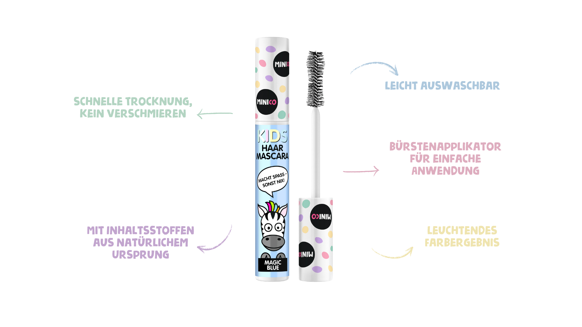 Mit dem praktischen Bürstenapplikator ist die Anwendung der Haarmascara spielend leicht. Dank der speziell designten Bürste und der seidigen Textur, lässt sich die Farbe optimal im Haar verteilen: ob kleine Highlights oder intensive Farbergebnisse. Hier sind der Fantasie der Kinder keine Grenzen gesetzt.